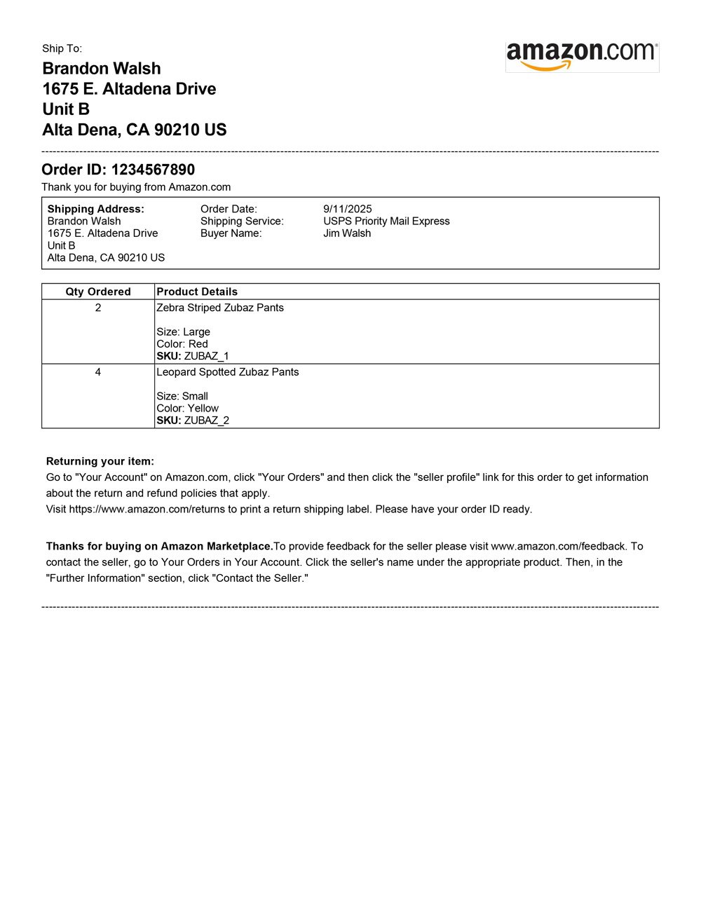 Amazon 8.5x11 Packing Slip Templates
