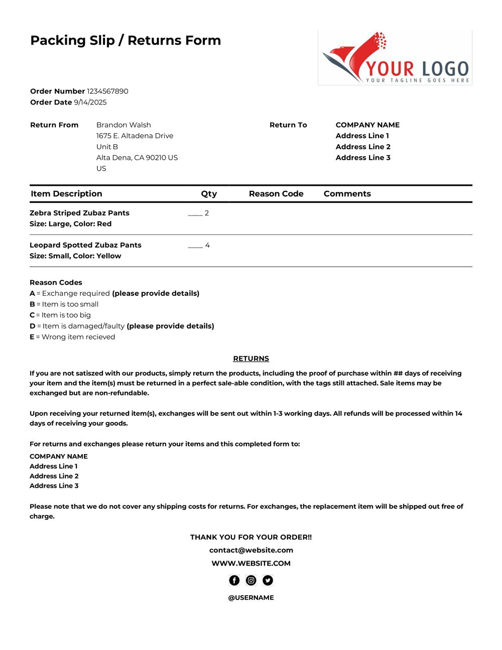 This custom designed 8.5x11 packing slip is great for a store that needs custom return instructions. Modify it for your business! Use this custom packing slip for your Shipstation.com store today!