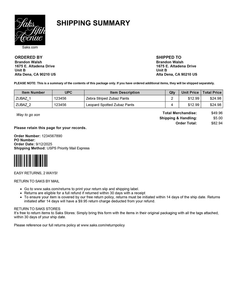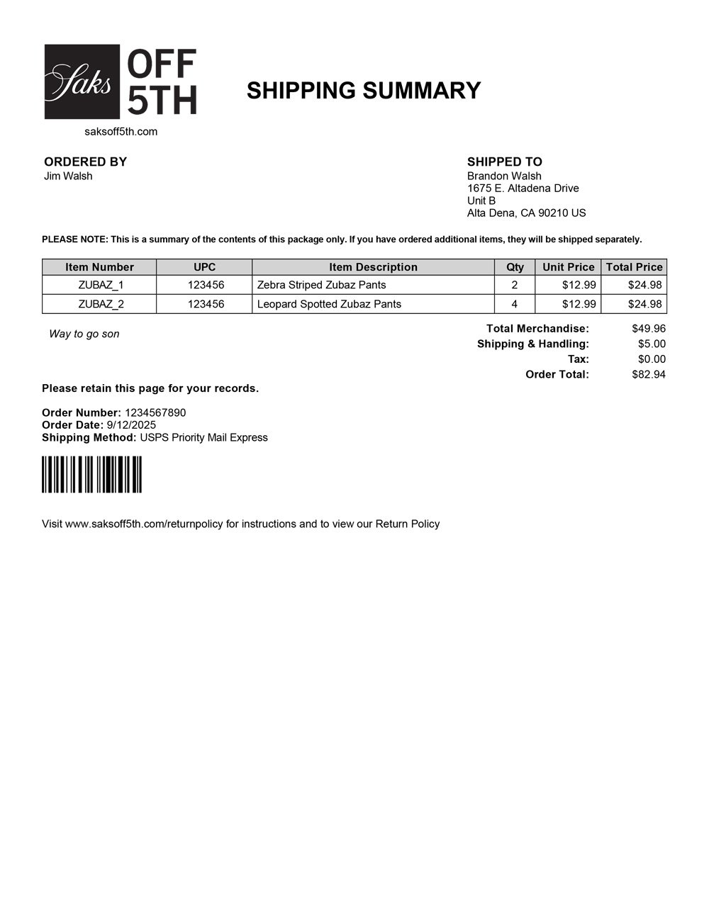 Saks Fifth Avenue 8.5x11 Packing Slip Templates