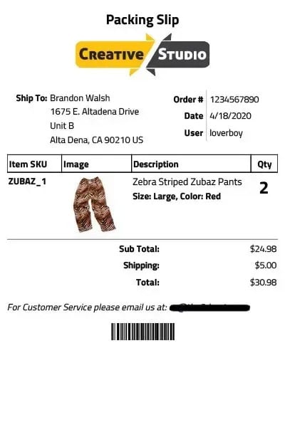 Pictured below is an example 4x6 Shipstation packing slip that shows one product image per line in the order. If you're familiar with Shipstation's customized packing slip layout, there are four key sections that need to contain code in order for the packing slip to display properly.